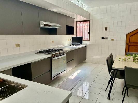 Recibidor, sala amplia, el comedor está en dos áreas, medio baño de visitas. La cocina se ha remodelada, área muy amplia junto está el ante-comedor.